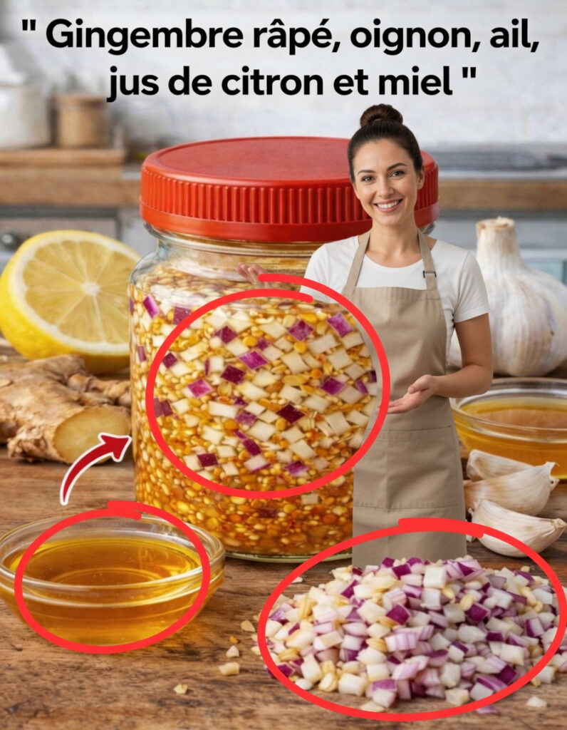C’est précisément pour cette raison que ce mélange maison à base de gingembre râpé, d’oignon, d’ail, de jus de citron et de miel suscite autant d’intérêt. Préparé avec des ingrédients courants que l’on trouve facilement en cuisine, il ne demande ni matériel spécial ni technique compliquée. Ce qui surprend le plus, c’est qu’après une semaine de repos, ces éléments simples se transforment en une préparation harmonieuse, parfumée et agréable à intégrer dans une routine quotidienne.