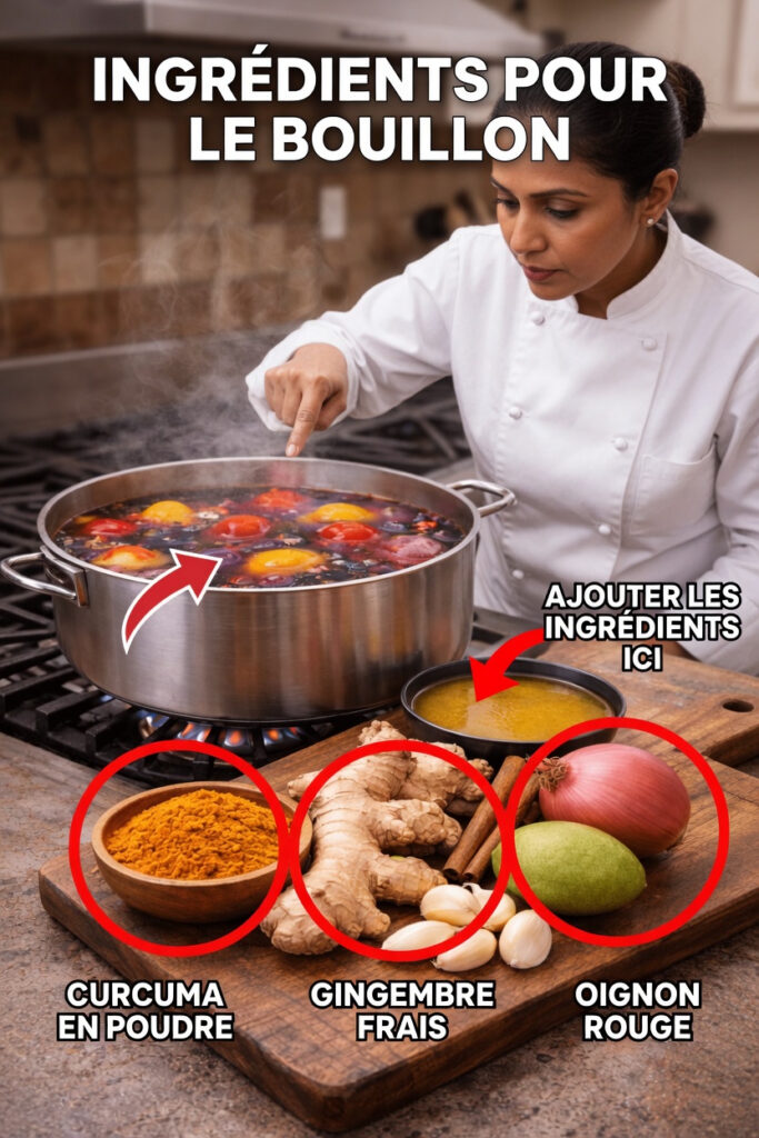 2. Ajoutez l’ail, le curcuma, l’oignon, le gingembre, la cannelle et les feuilles de goyavier.