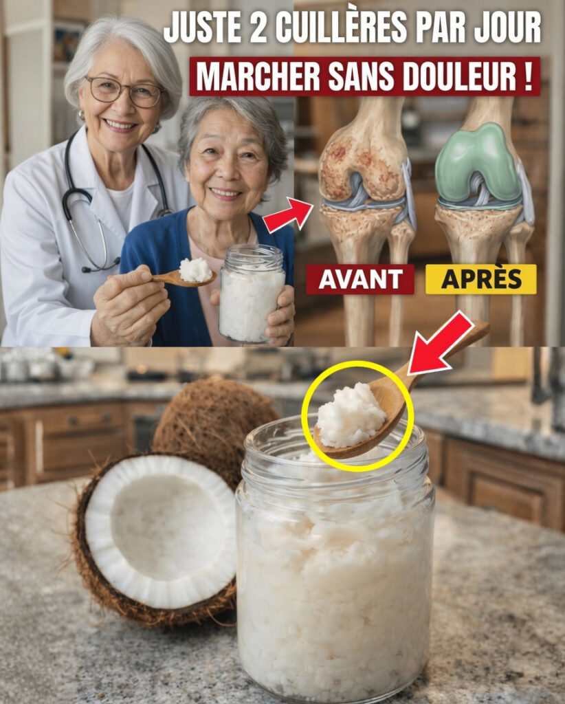 Vous avez peut-être déjà vu passer ces publications marquantes montrant un médecin âgé en blouse blanche, des images spectaculaires de genoux “avant/après” et un pot d’huile de coco blanche et épaisse. Le message diffusé est souvent le même : consommer deux cuillères par jour pourrait faire partie d’une habitude intéressante pour soutenir le confort articulaire.