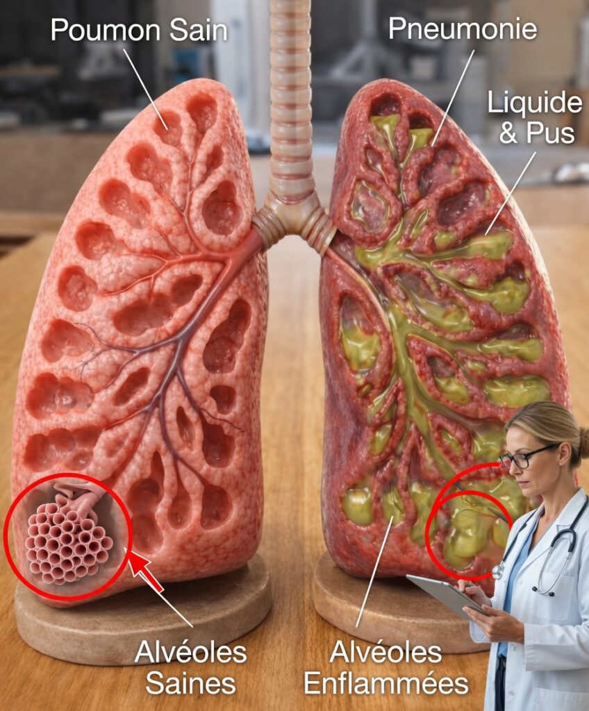 La pneumonie est une infection des poumons qui provoque une inflammation des alvéoles (les petits sacs d’air où se font les échanges d’oxygène). Lorsque ces alvéoles se remplissent de liquide ou de pus, la respiration devient douloureuse et l’oxygénation du corps diminue.